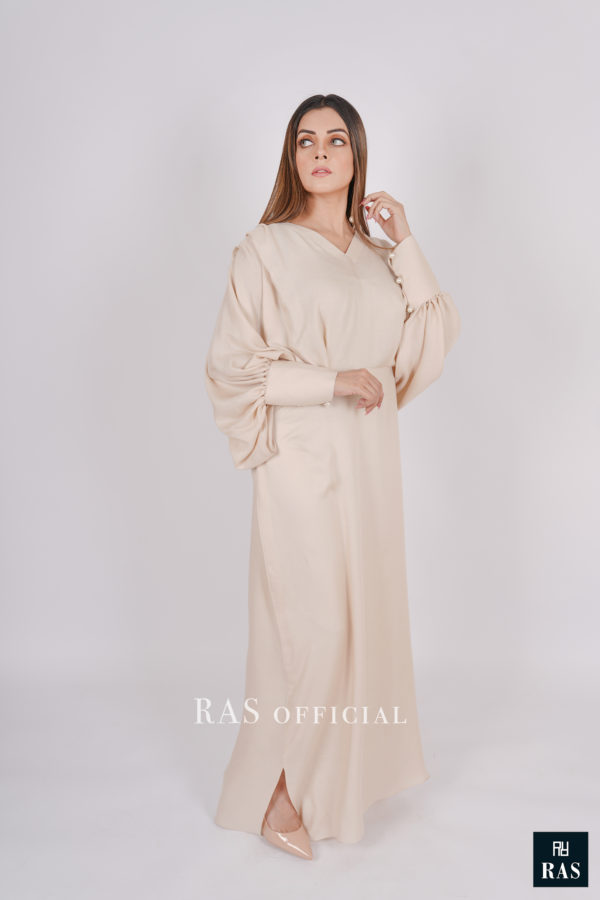 Classic beige, pure imported soft grip fabric with hint of pearls and intricate embroidery on back. Victorian style sleeves with pearls detailing.