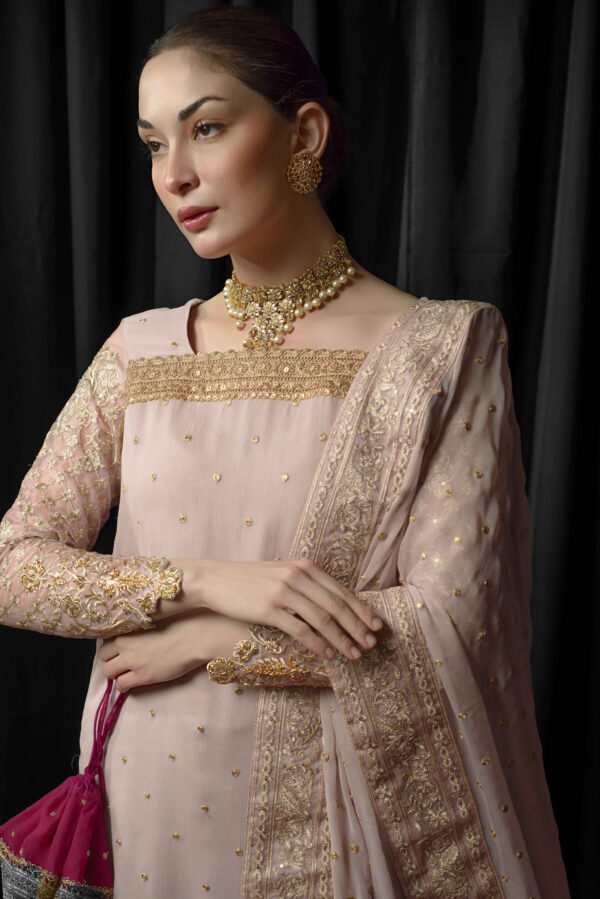 Delicately embroidered onion pink shade pure chiffon long shirt with delicate embellishment of Kora nakshi, Dubka, Tilla, Resham, sequin work on sleeves and neck.