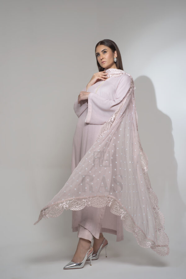 Pure self textured malai lawn with pearls detailing on neck. Shirt length 50.