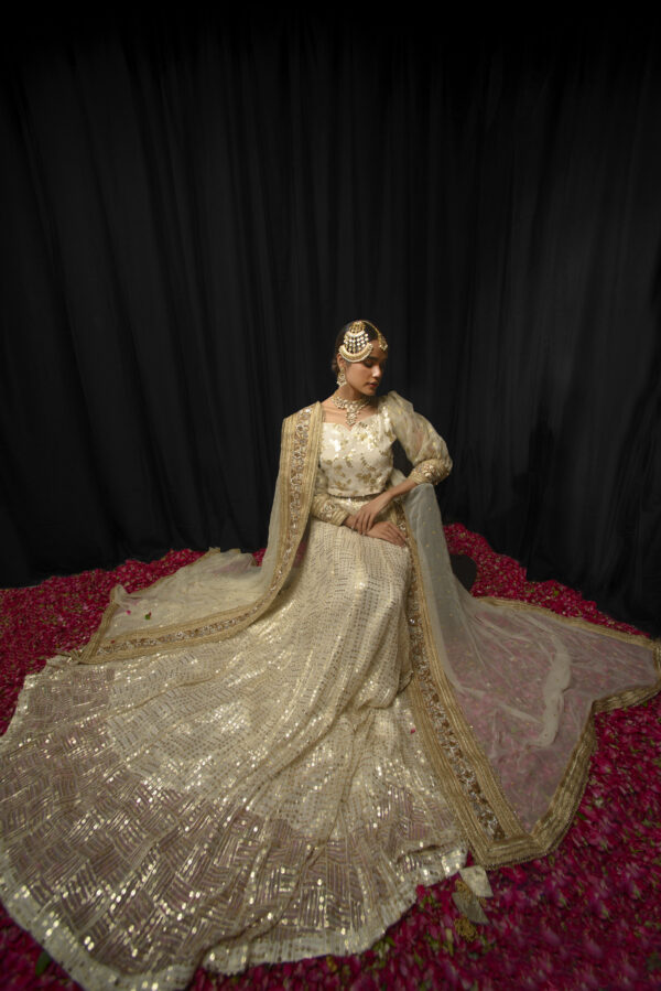 This modern cut pure chiffon off white choli top with Roman style balloon sleeves made from pure organza embellished with silver kora, dubka, nukshi.