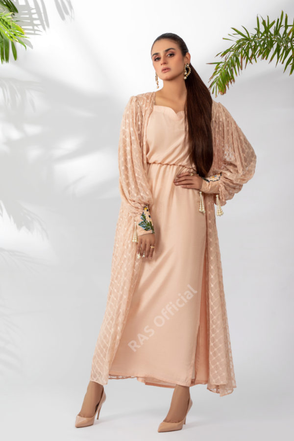Meticulously embroidered chiffon panelled jacket with intricate resham work on cuffs along with Pearls tussles.