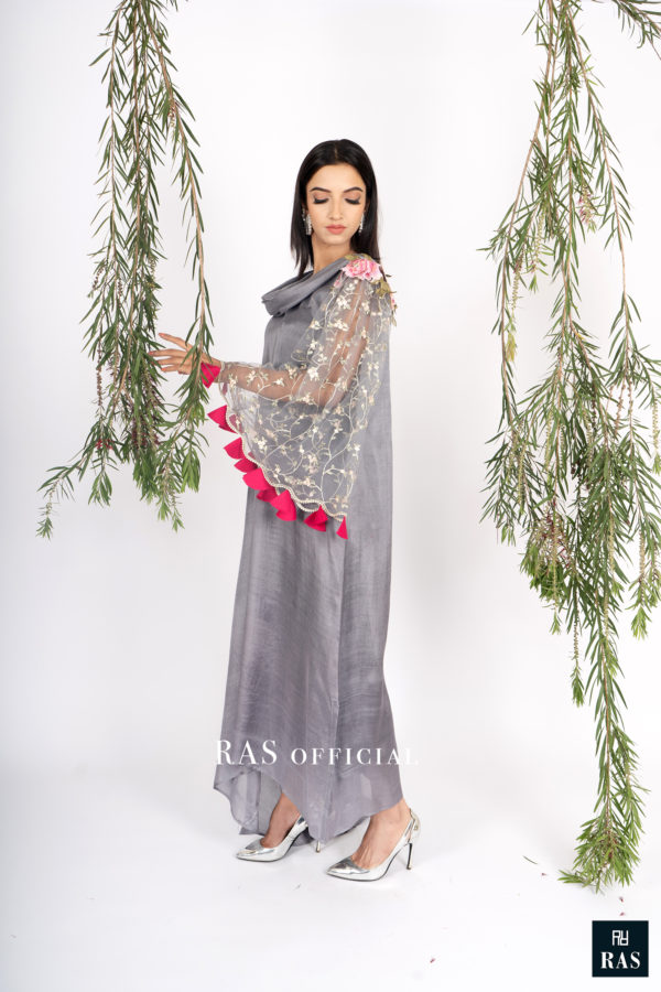 Asymmetric free-size raw silk drape long with embroidered tulle bell sleeve adorned with embroidered appliqué and fabric drops.