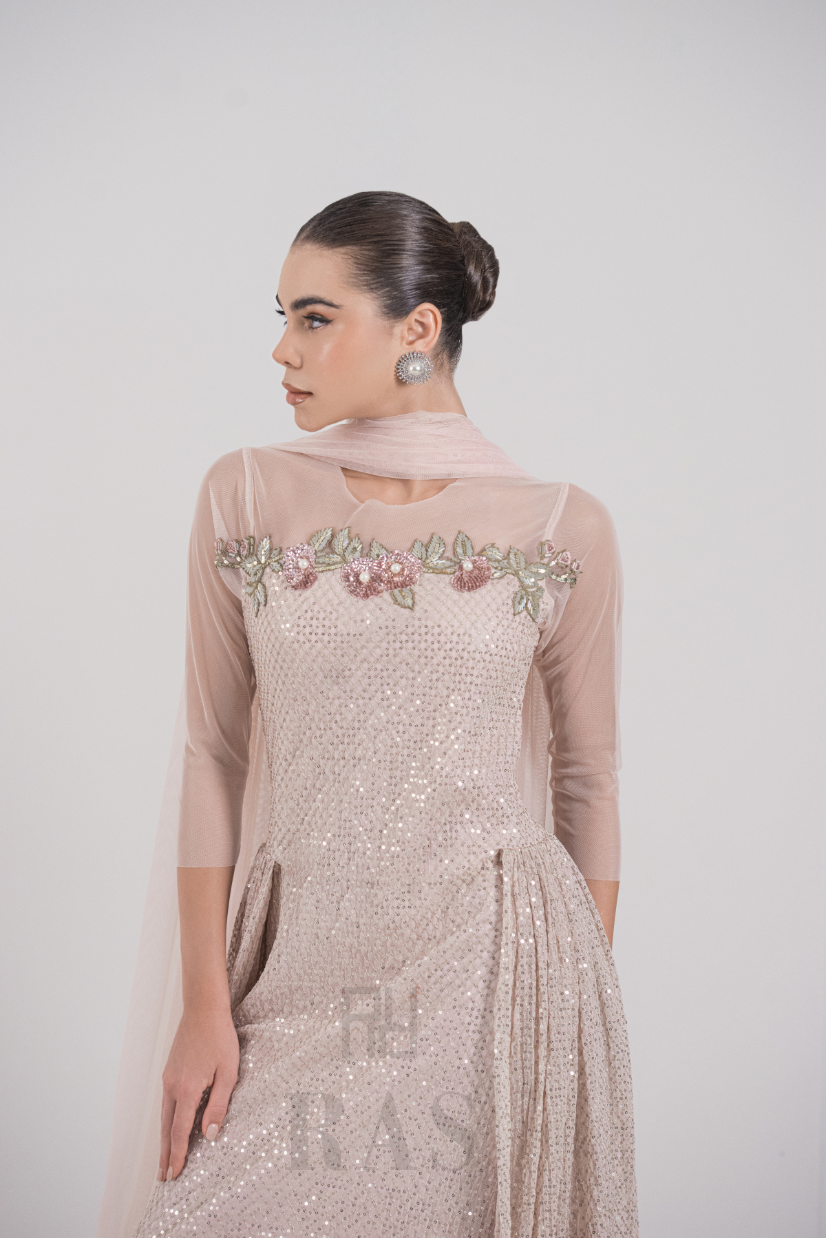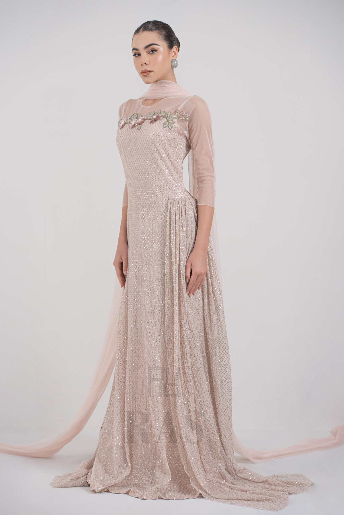 Sequin, beads, pearl embroidered tulle long dress in baby pink,